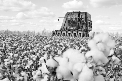 正值收棉季节,新疆棉花采用大规模机械采摘作业。张聚明/图